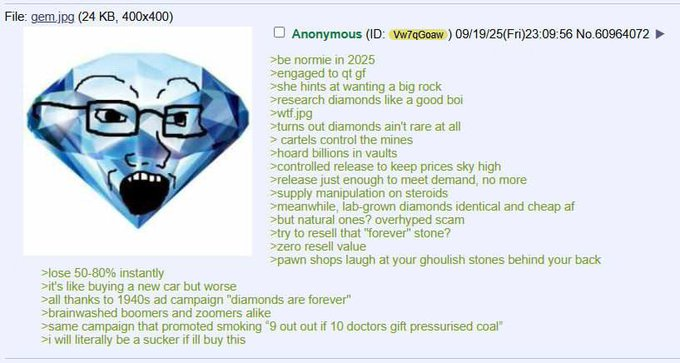 arrow-up1174arrow-down1imageAnon shops for diamondssh.itjust.works🍹Early to RISA 🧉@sh.itjust.worksM to Greentext@sh.itjust.works · 6 hours agomessage-square32fedilink