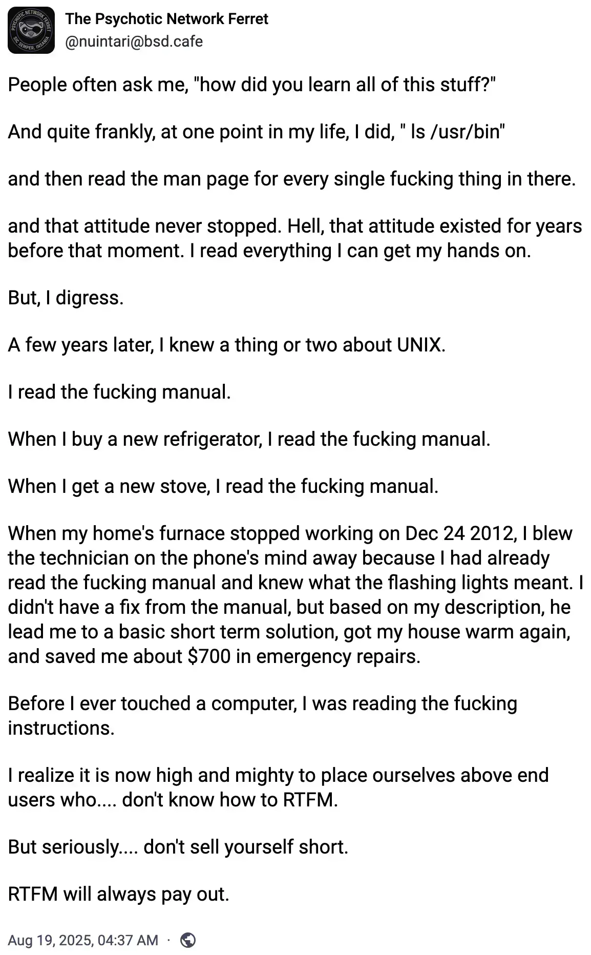 The man manpage. I’m sure it was the first one you read? Because you wanted to know how man worked?