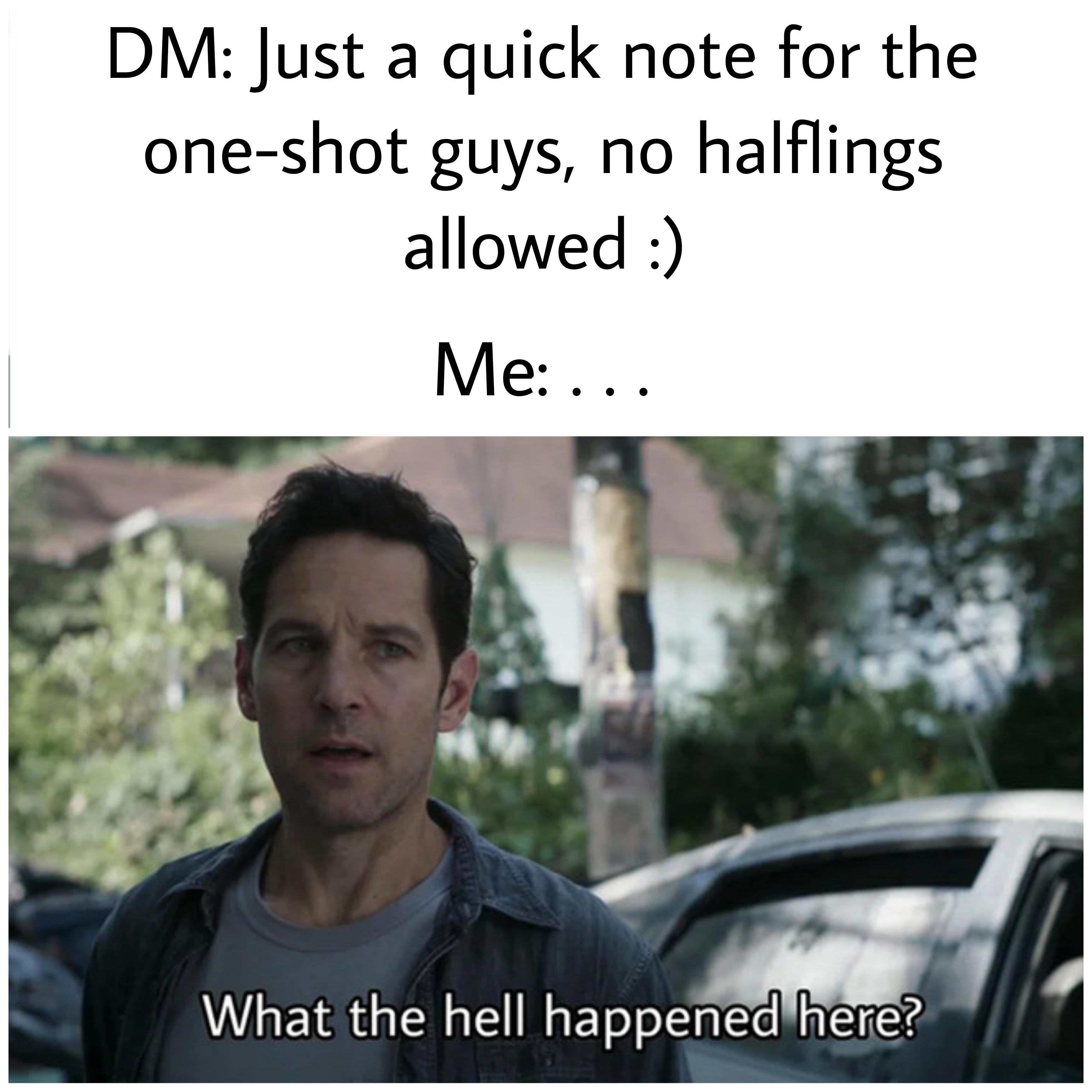 The entire party showed up all using Zee Bashew’s lucky halfling diviner build and called themselves the Fellowship of the Rng