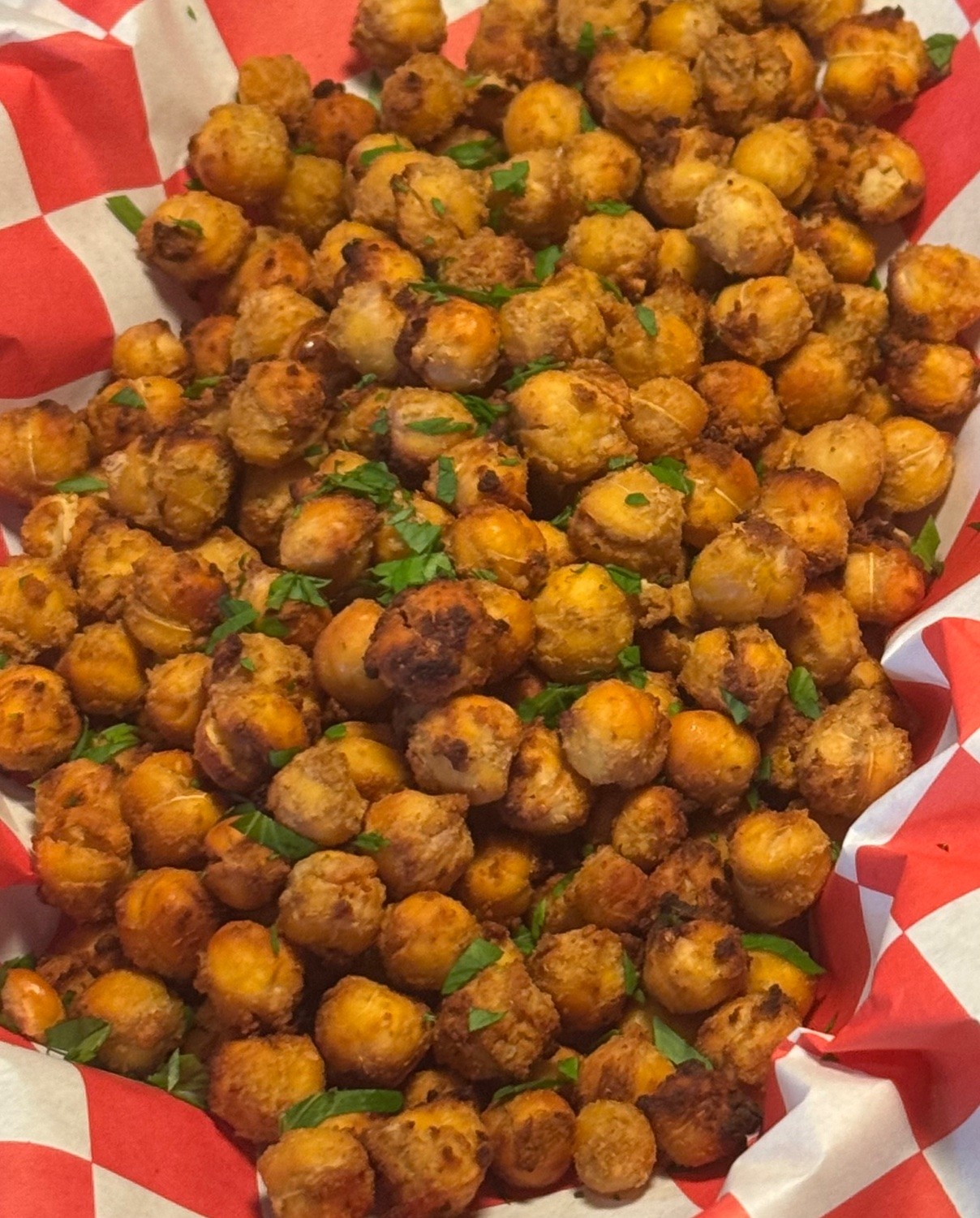 drain a can of chick peas, add a teaspoon of garlic olive oil, a few tablespoons of spice and stir well. air fry 12 minutes at 400°f/200°c stirring twice. top with fresh herbs and serve hot!