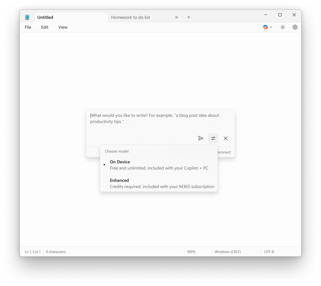 Notepad now supports AI features like Summarize, Write, and Rewrite on Copilot+ PCs, with no subscription required. If you have a subscription, you can seamlessly switch between local and cloud models based on your needs. If you’re not signed in or don’t have a subscription, you can use the local model to accomplish your tasks. For now, these features support English only, making premium AI more accessible and flexible for everyone.