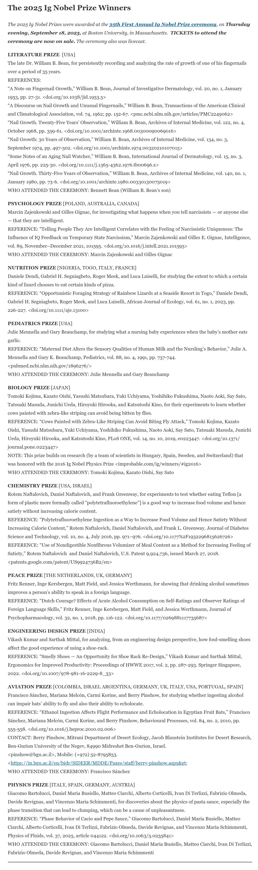 The 2025 Ig Nobel Prizes were awarded at the 35th First Annual Ig Nobel Prize ceremony, on Thursday evening, September 18, 2025, at Boston University, in Massachusetts. TICKETS to attend the ceremony are now on sale. The ceremony also was livecast.