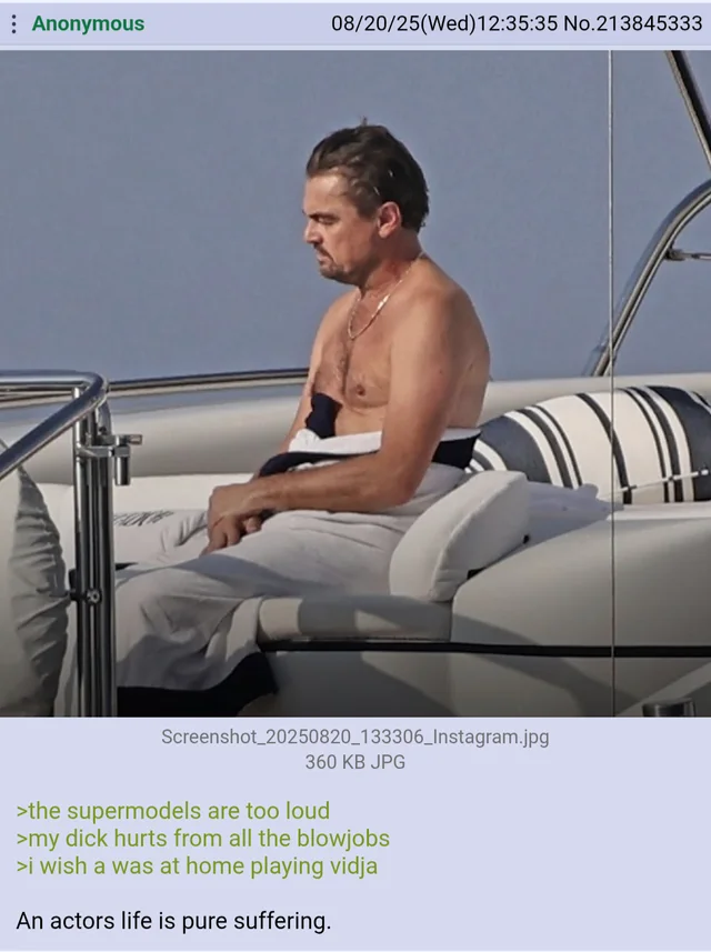 minus-squareEldenLord@lemmy.worldlinkfedilinkarrow-up66·17 days agoMore like: Headache from doing blow last evening GF turned 25 and thus became too old still cringes inside from his acting role in titanic