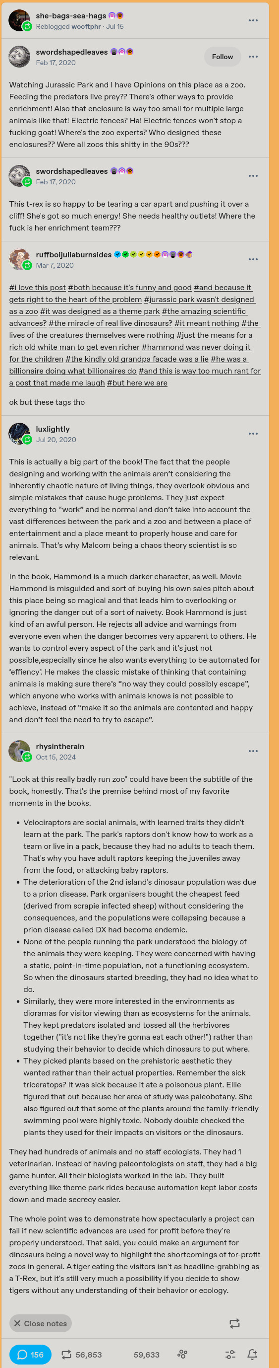 Yeah, “we’ve spared no expense” is a dramatically ironic line in the book, because the reader sees Hammond cutting costs at every single opportunity. Every single time Hammond drops that line, it’s almost immediately preceded or followed by an example of him cutting corners to save money.