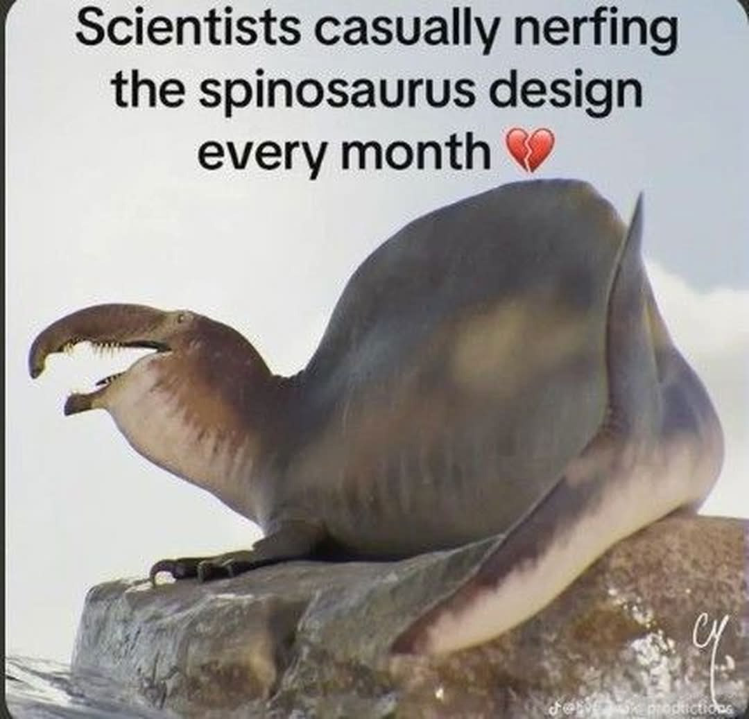 from what i know of spinosaurus this has to be one of those semi-tongue-in-cheek depictions that show something clearly made up yet way more sensible than early paleoart, to make a point about how we should keep an open mind and that these animals PROBABLY ACTUALLY LOOKED LIKE ANIMALS